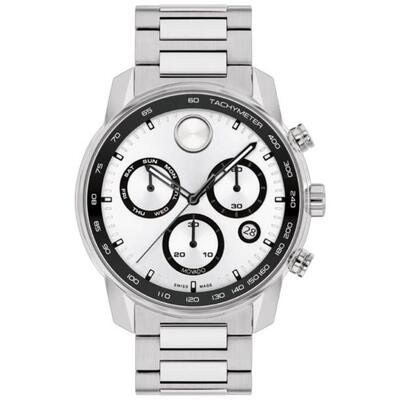 Silver-tone stainless steel case and bracelet, fixed silver-tone bezel. White dial featuring black hour/minute hands and index markers with minute gradations at the outer rim. Analog display, luminescent accents on hands/markers, date window at the 4 o'clock position. Powered by a quartz movement. Solid case back. Round shape measuring 44 mm in diameter. Secured by a fold over clasp equipped with safety release mechanism. Water resistant to 50 meters (165 feet). Functions include chronograph, day display, date function, hour hand, minute hand, and second hand. Belongs to the Verso Series collection. Luxury style watch labeled Swiss Made.