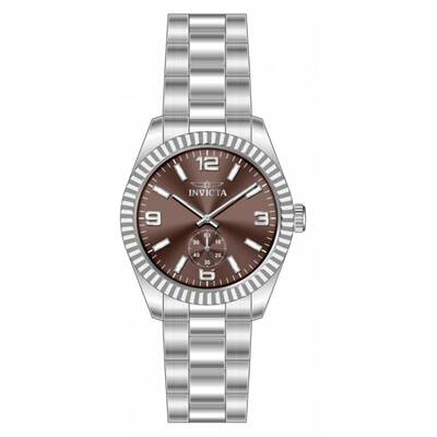 Silver-tone stainless steel case with fixed silver-tone bezel. Brown dial equipped with silver-tone hands and index-Arabic numeral hour markers, plus minute markers around the outer rim; Analog dial type featuring a subdial for small second display. Powered by TMI Caliber VD78 quartz movement. Features a scratch-resistant mineral crystal lens. Operated via pull/push crown. Comes with solid case back. Round 43mm case size and matching bracelet width of 22mm. Includes fold over clasp with safety release mechanism. Water resistant up to 50 meters (165 feet). Functions display hour, minute, small second.