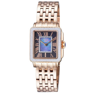 Women's watch from the Padova Series featuring an analog quartz movement. Rose gold-tone stainless steel case and bracelet with fixed bezel of the same material. The blue dial displays rose gold-tone hands and Roman numeral & index hour markers. Equipped with a scratch-resistant sapphire crystal glass, deployment clasp closure, rectangular shape measuring 27mm width by 9.5mm thickness, 18mm band width. Water resistant up to 30 meters (100 feet).
