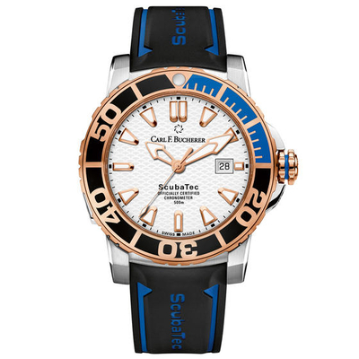 Sapphire scratch resistant crystal, unidirectional rotating ceramic and steel bezel with black/blue (Batman) insert, stainless steel case, automatic movement Caliber CFB 1950.1 with 26 jewels & 38-hour power reserve, luminous white dial, rose gold-tone hands and indices with minute markers, date display at the three o'clock position, analog functions, sapphire crystal lens, screw-down crown, solid case back, round shape measuring 44.6mm diameter and 13.45mm thickness, black rubber strap equipped with a deployment push-button clasp, water resistant to 500 meters.