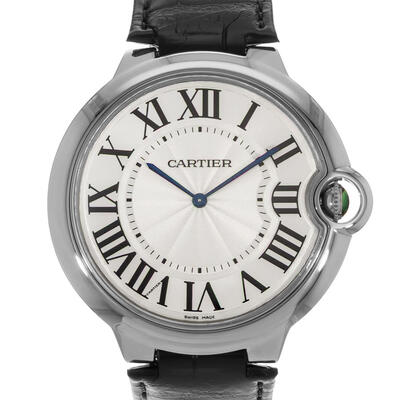 Pre-owned luxury men's watch from the Ballon Bleu collection. Item number W6920055. Swiss Made movement: Cartier Calibre 430 MC, manual winding, approximately 40 hour power reserve, beating at 21600 vph with 18 jewels. Analog dial type featuring silver-tone face, blued-steel sword-shaped hands, Roman numeral markers, minute scale around the inner rim. Fixed bezel made of white gold (18kt). Black leather strap bracelet. Scratch resistant sapphire crystal lens. Cabochon crown finish. Solid case back. Round 46mm case size. Fold over clasp equipped with safety release mechanism. Water resistance rated to 30 meters / 100 feet.
