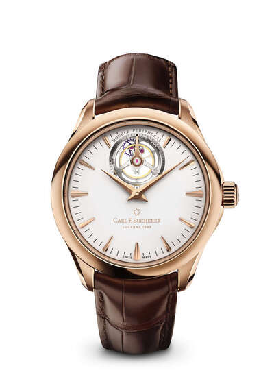 Analog Swiss Made Men's Watch with automatic movement from Carl F. Bucherer. Features an 18k rose gold case, brown alligator leather strap, 18k rose gold bezel, and a silver dial accented with rose gold-tone hands and index hour markers. Equipped with Calibre T3000 automatic mechanical movement providing a 65-hour power reserve. Protected by scratch resistant sapphire crystal and features a sapphire case back for visibility. Round shaped case measuring 43.1 mm in diameter. Includes an 18k rose gold folding clasp buckle. Water resistant up to 30 meters / 100 feet depth, suitable for shallow water activities but not diving.