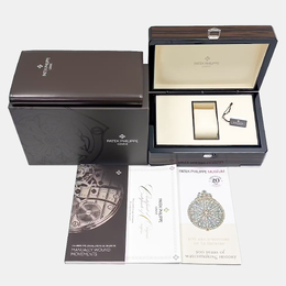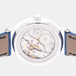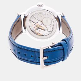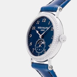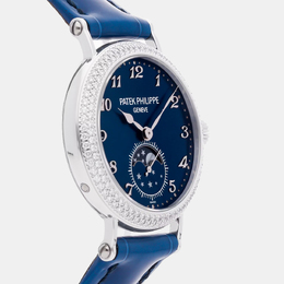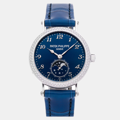 Pre-owned luxury ladies' wristwatch featuring a manual winding movement, moon phase complication, diamond-adorned bezel set in an elegant white gold case measuring 33mm in diameter. The deep blue sunburst dial features Breguet-style numerals for optimal legibility and contrast.