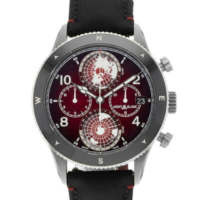 A pre-owned men's Montblanc Chronograph with automatic movement and a red dial. The watch features an analog dial displaying hours, minutes, seconds, and date at the 3 o'clock position, marked by black hands and Arabic numeral hour markers for optimal readability. It is equipped with luminous elements on the hands and outer minute markers. The grey titanium case houses a black fabric strap and includes a titanium bezel. This timepiece belongs to the Montblanc 1858 Series, manufactured in Switzerland (Swiss Made).