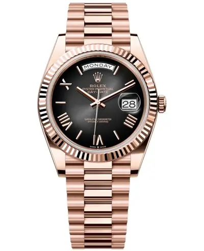 Brand new authentic Rolex day-date men's watch model m228235-0055. Automatic movement, caliber 3255 engine, 70 hour power reserve. Polished rose gold case and fluted bezel, grey dial featuring roman numeral and stick markers with day of the week at 12 o'clock and date at 3 o'clock. Includes scratch resistant sapphire crystal glass, screw down crown, solid case back, polished rose gold bracelet with crownclasp clasp, chronometer certified movement. Rated for 100 meters or approximately 330 feet water resistance.