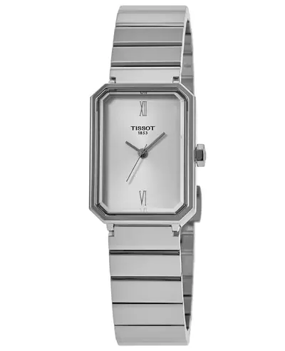 A women's dress watch from Tissot featuring a polished stainless steel case and band, secured with a polished stainless steel folding clasp. Fixed bezel construction complements its rectangular shape measuring 30mm in width and 7.25mm in thickness.