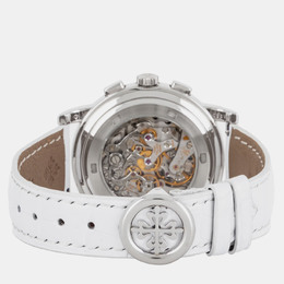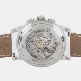 Patek Philippe Pre-Owned Chronograph Ref 1213737/5070P-001, crafted in platinum, automatic mechanical movement with chronograph function and date display, screw-down case back, typical for the era. Features include a central seconds hand, exhibition of the automatic winding system through a sapphire crystal caseback.