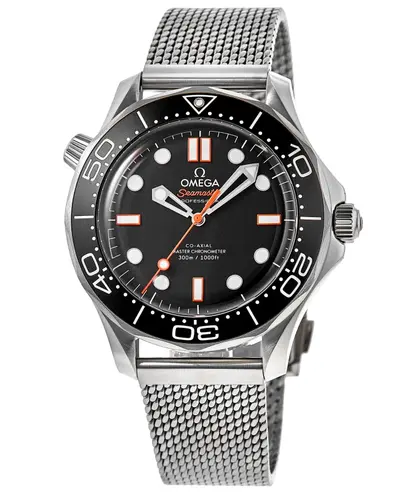 A brand new authentic Omega Seamaster Diver watch with model designation 210.30.42.20.01.018 featuring a black dial, luminous silver tone circle and stick hour markers with minute markers on the outer rim, brushed and polished stainless steel case and bracelet, polished stainless steel folding clasp, unidirectional rotating bezel, automatic chronometer movement (caliber 8806), screw-in crown, sapphire crystal, round shape measuring 42mm in diameter and 13.80mm thick, water resistant to 300 meters or 990 feet, and secured by a five-year WatchMaxx warranty.