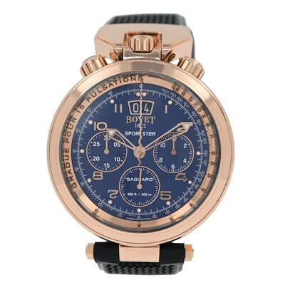 Rose gold-tone 18kt rose gold case with black rubber strap. Fixed bezel also in rose gold-tone 18kt material. Blue dial features rose gold-tone hands, Arabic numeral and index hour markers, minute markers on the outer rim. Analog dial type with luminous coating for both hands and markers ensuring visibility in low light conditions. Date display at the 12 o'clock position. Chronograph functions include three sub-dials: one for seconds (60-minute duration), minutes (30-minute duration) and hours (12-hour). Powered by an automatic movement, offering self-winding capability. Equipped with a scratch-resistant sapphire crystal glass to protect the dial. Includes screw-down winding/crown enhancing water resistance which is rated up to 300 meters / 1000 feet making it suitable for diving conditions. Transparent case back allowing view of the mechanism internals or any complications visible through there. Sportster Series classification, designed in a round shape with case size measuring 46 mm across the face from left-to-right when fully extended including lugs but excluding bezel thickness if applicable per standard measurement practices although user provided data states "case size: 46 mm" likely meaning overall diameter or lug-to-lug dimensions. Band length is 7.75 inches (converted to metric approximately 200mm). Secured with a buckle clasp closure system instead of deployant etc. Functions cover chronograph, date, hour, minute and second indications clearly visible on the dial face.