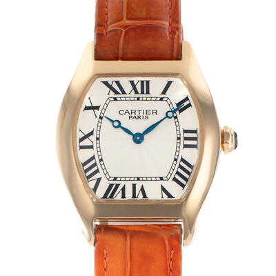 Analog Swiss made men's Cartier watch, model Tortue. Features an 18kt yellow gold case with a fixed bezel also in yellow gold-tone. Equipped with blued-steel sword-shaped hands and Roman numeral markers on the silver-tone dial including a minute scale around its inner rim. Powered by a hand-wind movement, has a cabochon crown finish. Tonneau shaped at 34.43mm with an orange leather strap secured via fold-over clasp featuring safety release mechanism. Includes hour and minute functions only.
