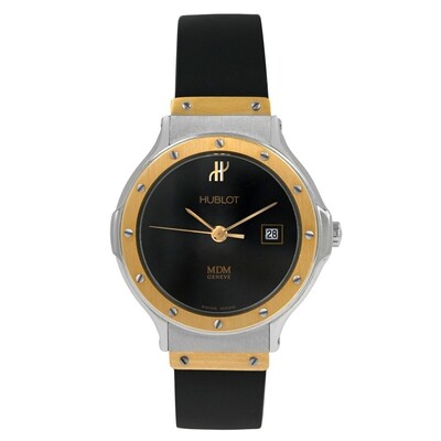Solid back, round shape size: 28 mm, Silver-tone stainless steel case with black rubber strap and fixed yellow gold-tone bezel made of 18kt yellow gold. Analog dial in black displaying date at the 3 o'clock position and featuring yellow gold-tone hands powered by quartz movement (battery-operated). Includes functions for hour, minute, second, and date display. Part of the Mdm Classic Series from Hublot, this pre-owned ladies watch boasts a luxury style with Swiss Made label.