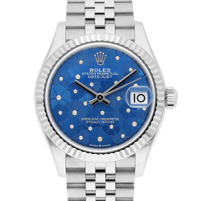 Diamond dial with azzurro-blue floral motif, analog functions including date at the 3 o'clock position. Powered by Rolex Calibre 2236 automatic movement containing 31 jewels and beating at 28800 vph. Power reserve approximates 55 hours. Features sapphire crystal for scratch resistance, screw-down crown. Stainless steel case coupled with a stainless steel white gold jubilee bracelet featuring concealed folding clasp. Includes solid case back. Water resistant to 100 meters / 330 feet depth. Fixed fluted bezel and round shape of size 31 mm. Dial incorporates 24 diamonds.