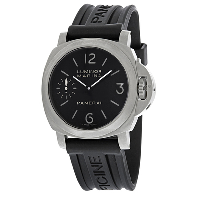 Silver-tone titanium case paired with a black rubber strap. Fixed silver-tone titanium bezel. Black dial featuring analog hour and minute indicators, including Arabic numerals and luminous indices. Silver-tone hands for enhanced readability. Analog dial type equipped with luminescent elements on the hands and markers. Powered by Panerai Calibre OP II hand-wind movement, based upon ETA 6497-1, containing 17 jewels, operates at a frequency of 21600 vph (approx. 3000 bph), offers an approximately 56-hour power reserve, and is certified chronometer status. Features scratch-resistant sapphire crystal, screw-down crown mechanism for water resistance up to 300 meters / 1000 feet, solid case back with the cushion shape, measuring 44 mm in diameter and 14 mm thick. Secured by a tang clasp. Dive watch style intended; Swiss Made label present.