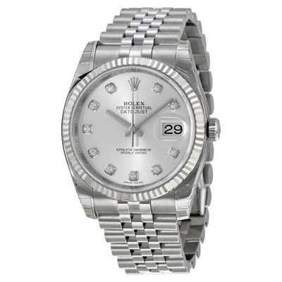 Pre-owned Stainless steel case with stainless steel jubilee bracelet. Fixed fluted 18kt white gold bezel on a men's analog automatic watch (Rolex). Silver dial features silver-tone hands and diamond hour markers. Sapphire crystal provides scratch resistance. Solid case back included. Case diameter is 36 mm, round shape equipped with hidden deployment clasp and measuring 50mm lug-to-lug width. Automatic movement offers up to 50 hours power reserve. Water resistant to 100 meters (approx. 330 feet). Analog date display at the 3 o'clock position.