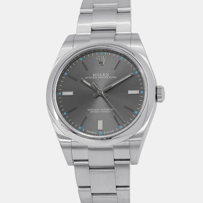 A stainless steel automatic men's wristwatch with a dark dial, featuring the Oyster Perpetual movement. Case diameter is 39 mm and constructed from Rolesium material.