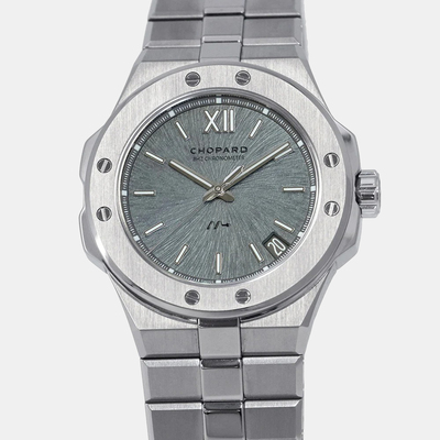 This Chopard Alpine Eagle model features a lightweight titanium case, measuring 41 mm in diameter. The watch showcases a textured grey dial and is specifically designed for men with automatic movement that winds itself as you wear it. It ensures comfort on the wrist despite its sportier build.