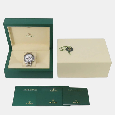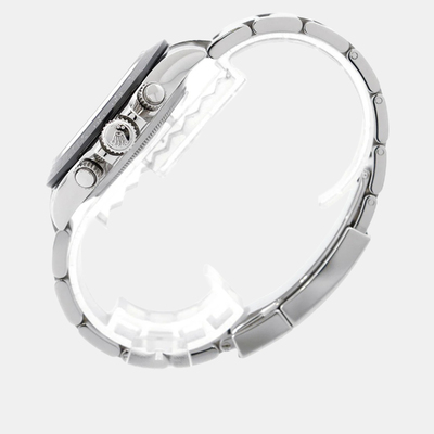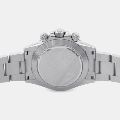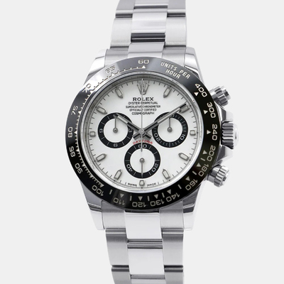 A stainless steel case houses the automatic movement of this men's Rolex Cosmograph Daytona. Features a clean white dial set against an array of black ceramic sub dials on its bezel, all surrounded by meticulous finishing characteristic of the brand.