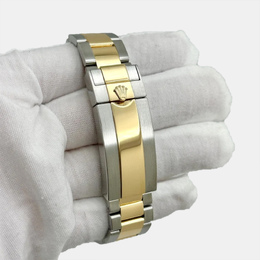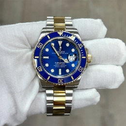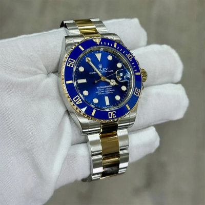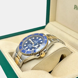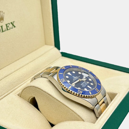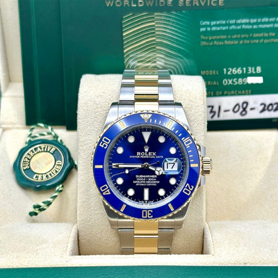 A Rolex Submariner men's wristwatch from reference number 126613LB, featuring an automatic movement and a vibrant blue dial crafted in 18k yellow gold with stainless steel elements.