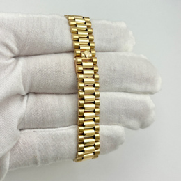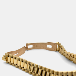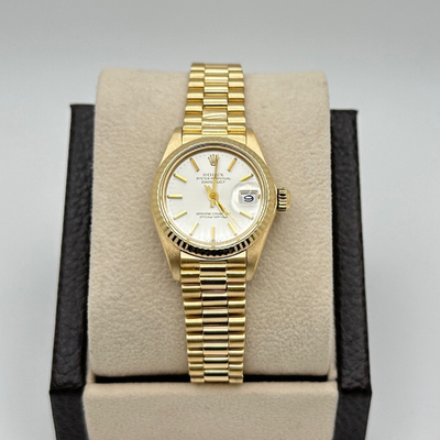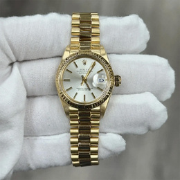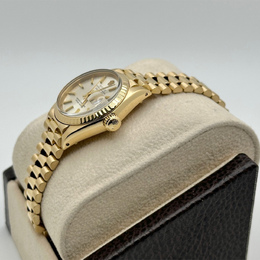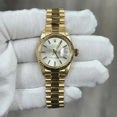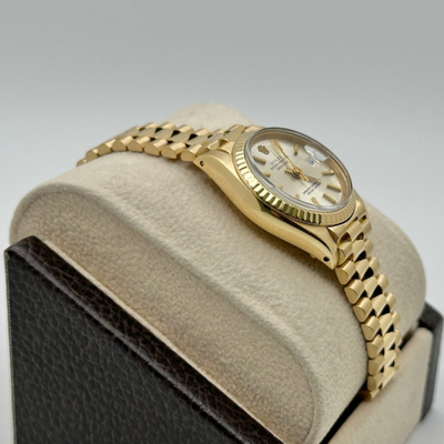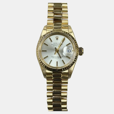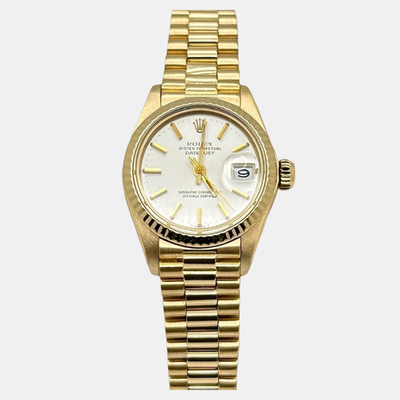 Diameter: 26 mm; Case Material: Yellow Gold (18k); Dial Color: Silver; Movement Type: Automatic; Functionality: Date Display via Aperture; Crystal Cover: Sapphire crystal; Item Condition: Pre-owned Genuine.