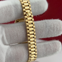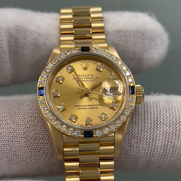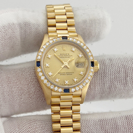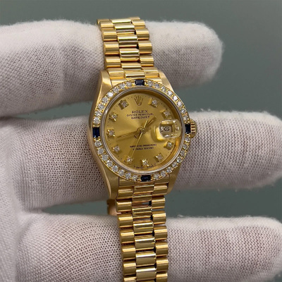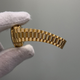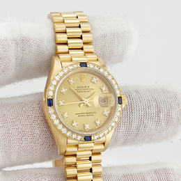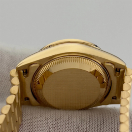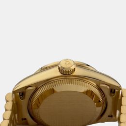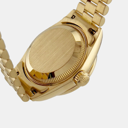 Genuine Pre-Owned. Rendered in 18k yellow gold with diamond accents on the bracelet and bezel insert, featuring a size of 26mm, automatic movement ensuring precise functionality, model President Datejust, known for its sophisticated blend of classic design and elegant presence.