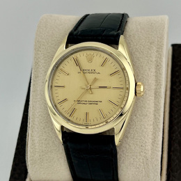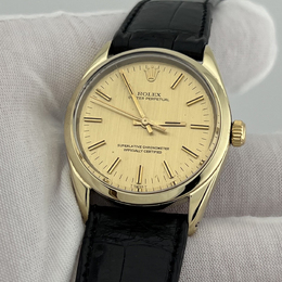 Features: Warm champagne dial, Automatic mechanical movement (caliber), Date display function through sapphire crystal, Screw-down bezel clasp with Oysterlock safety clutch, Solid link bracelet, Water resistant to 100 meters or 330 feet, Luminous hands and markers for low-light visibility. Dimensions: Case size 34 mm.
