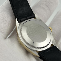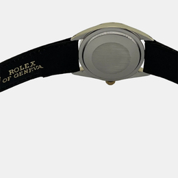 a warm champagne dial with automatic movement. Boasting a 34 mm 18k yellow gold and stainless steel case, this genuine pre owned Rolex women's wristwatch is crafted from 18k Yellow Gold Stainless Steel.