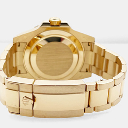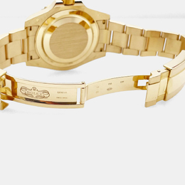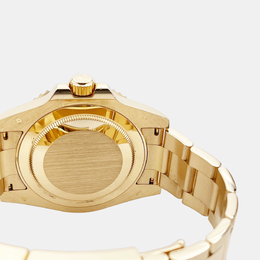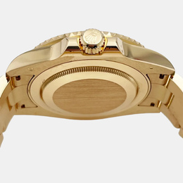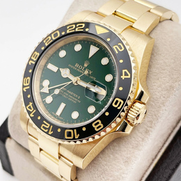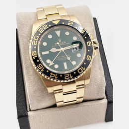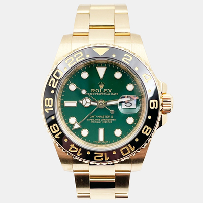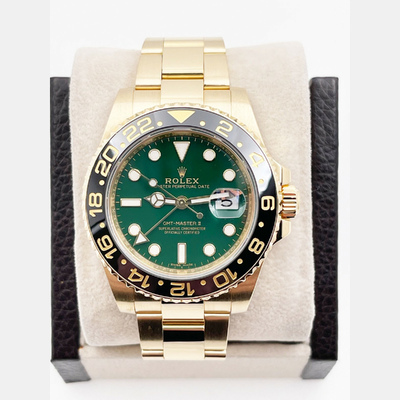 A pre-owned Rolex GMT-Master II model 116718 featuring an automatic movement (Caliber 3235). The watch has a 40 mm diameter case crafted from 18k yellow gold. It is equipped with a dual time zone function, distinguished by its bezel made of alternating green and black ceramic material on the insert flange, set against a genuine Rolex dial likely finished in various tones including white or sunray commonly seen for this model. This men's wristwatch includes luminous hour markers, possesses screw-in caseback functionality typical of GMTs, is presented with original Rolex documentation (strap/bracelet included), and represents an ideal blend of robust design suitable for everyday wear combined with the refined style and precision expected from a genuine Rolex timepiece.