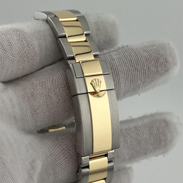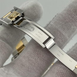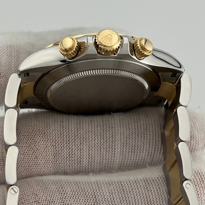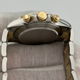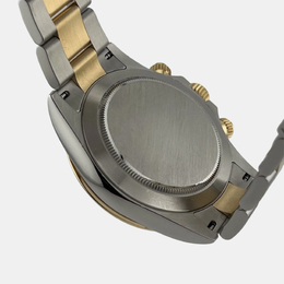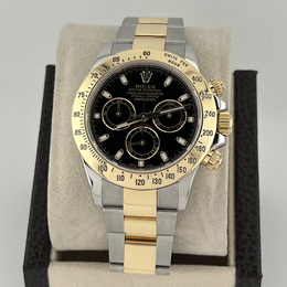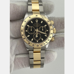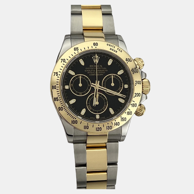 The Rolex Cosmograph Daytona model CK2000 is equipped with an automatic chronograph movement. It boasts a black dial finished in grand feu enamel, accented by indexes crafted from 18ct yellow gold and luminous material for enhanced legibility even in low light conditions. The case features polished Oystersteel stainless steel construction paired with solid 18ct yellow gold lugs, measuring 40 mm in diameter. This timepiece is presented on a black alligator leather strap secured by an Oysterclasp folding clasp finisher in polished 18ct yellow gold. It comes with the standard Rolex Calibre 32 movement ensuring precise chronograph functionality and accurate timekeeping.