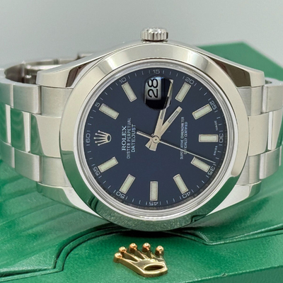 Bold yet elegant, this automatic movement stainless steel men's wristwatch features a striking blue dial and robust 41 mm case. Reference number: 116300.
