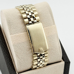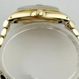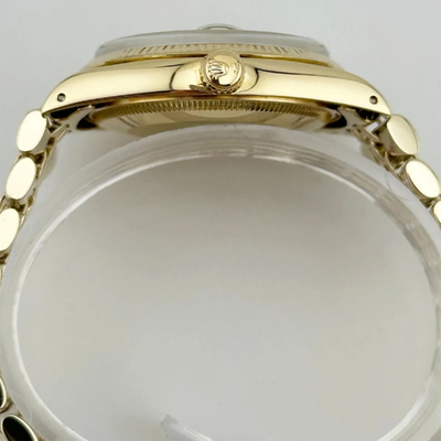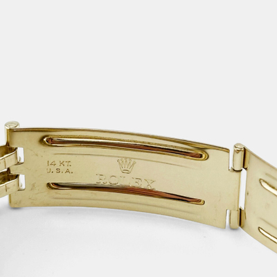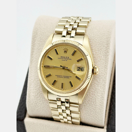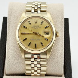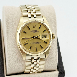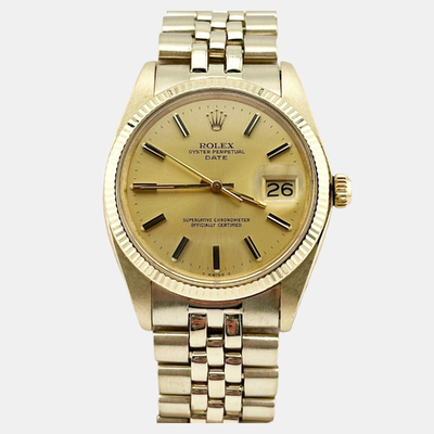 A Rolex Date 1503 men's wristwatch in 14K yellow gold with a champagne dial features an automatic movement (caliber 3135). It has radial hour markers, Roman numerals for the date window and indexation on the champagne dial, crafted from yellow gold set against the radiant dial. Equipped with sapphire crystal glass treated to be scratch-resistant and retains Rolex's renowned mechanical precision via its self-winding automatic mechanism. The bracelet is made of brown crocodile leather (or another fine material) accented by black lacquer details possibly including bead links.