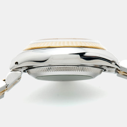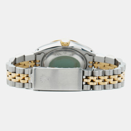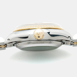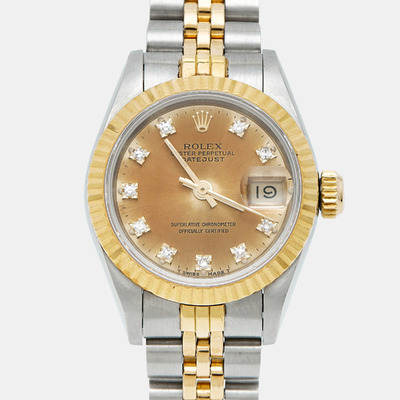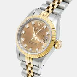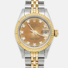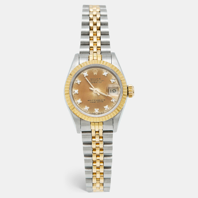 A luxury women's watch from the iconic Rolex Datejust collection, model number 69173. Features a stunning champagne colored dial enhanced with diamond hour markers for exceptional radiance. The case and fluted bezel are crafted from 18k yellow gold, while the bracelet is the classic Jubilee design made of stainless steel, creating a beautiful contrast. This automatic movement wristwatch has a diameter of approximately 26 mm.