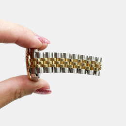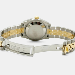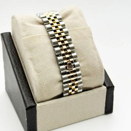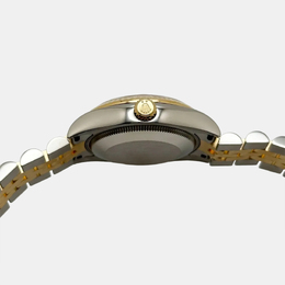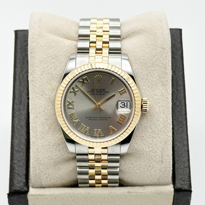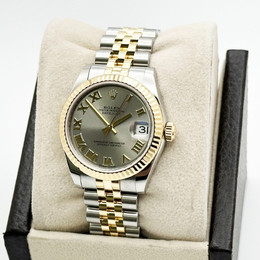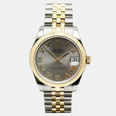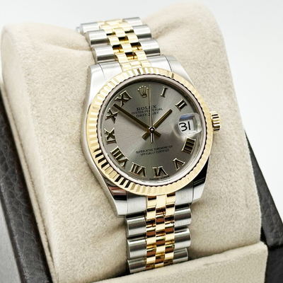 A men's automatic watch from Rolex, model Datejust 178273. Features a yellow gold and stainless steel case, measures 31 mm in diameter. Equipped with an automatic movement ensuring precise timekeeping. The dial displays Roman numeral hour markers on a silver tone finish. Includes luminous hands for improved legibility in low light conditions. Adorned with diamonds strategically placed around the bezel set in yellow gold tones and likely accents on the bracelet links as per typical Datejust design elements for this model, enhancing its sparkle. A statement piece showcasing iconic Rolex craftsmanship.