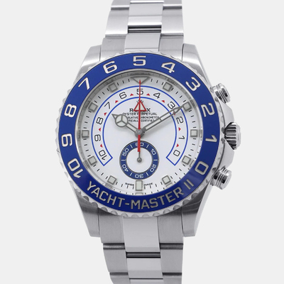 A men's automatic stainless steel Rolex Yacht-Master II with a white dial and measuring 44mm. Features programmable regatta countdown timer, ideal for marine timing.