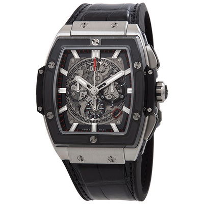 A pre-owned Hublot Spirit of Big Bang men's chronograph featuring a black skeleton dial with luminous hands and index hour markers, date display between the fourth and fifth o'clock positions, three sub-dials for seconds, minutes, and tenths of a second (60-second function), fixed black titanium bezel, grey titanium case, black rubber strap with stitched alligator leather inlay. Equipped with Hublot Calibre HUB4700 automatic movement (31 Jewels, 278 parts) offering approximately 50 hours power reserve and beating at 36000 vph. Includes scratch-resistant sapphire crystal, pull/push crown, transparent case back, tonneau shape, dimensions of 51 mm x 45 mm, fold-over clasp with push button release, water resistance to 100 meters (330 feet), and analog functions for hours, minutes, seconds.