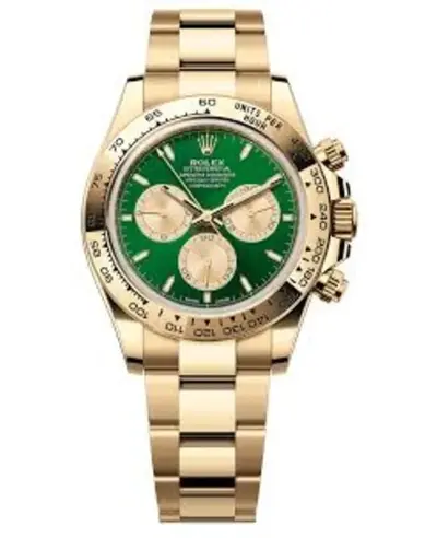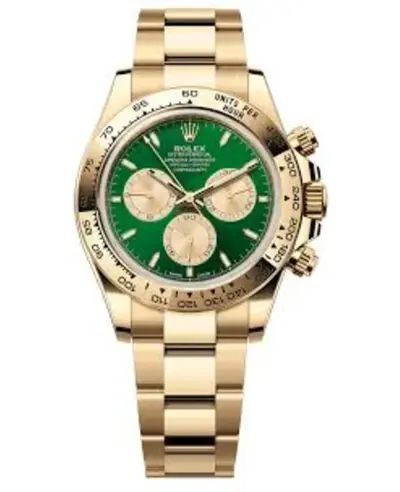 An authentic Rolex Cosmograph Daytona men's watch model 126508-0008. Features an 18kt Yellow Gold case, Brushed and Polished finish on both the case and bracelet which is also in Yellow Gold (18kt), equipped with a fixed bezel featuring an engraved Tachymetric scale (Yellow Gold). The Bright Green dial displays the time beautifully with its Golden hue. Powered by Rolex's Perpetual Mechanical Chronograph Self-Winding movement, Caliber 4131. Includes key functions: Power Reserve up to 72 hours, Hour, Minute, Second display, and a functioning Chronograph equipped with sub-dials for minutes (up to 30), seconds (60) and hours (12). Features a Screw-Down crown, Scratch Resistant Sapphire crystal, a round Monobloc Middle Case construction in Yellow Gold (18kt), Screw-Down case back, is water resistant up to 100 meters / 330 feet. Comes with the original manufacturer warranty for five years.