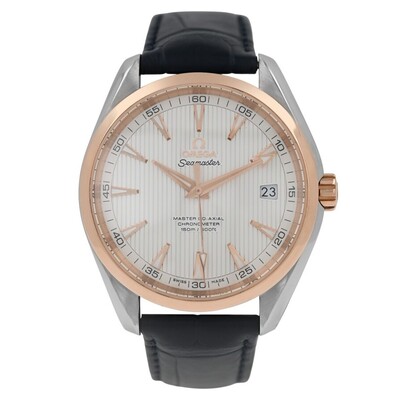Aqua Terra Series, Swiss Made, Analog Dial Type with Arabic and Index Hour Markers in Rose Gold Tone, Luminescent Hands and Markers for Night Readability, Date Display at 3 O'Clock Position, Omega Calibre 8500 Automatic Movement (25200 vph), Case Size Approx. 41.5 mm, Fixed Bezel 18kt Rose Gold Tone, Silver Stainless Steel Case with Black Leather Strap, Pull/Push Crown, Transparent Sapphire Crystal Case Back and Crystal Face, Scratch Resistant Sapphire Crystal, Round Shape, Fold Over Clasp with Safety Release, Water Resistant to 150 Meters (Approx. 500 Feet), Includes Date Function, Hour Minute Second Display