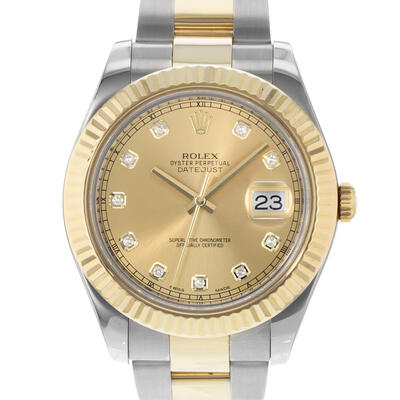 Pre-owned luxury mens automatic chronometer. Silver-tone stainless steel case with champagne dial featuring yellow gold-tone hands and diamond hour markers, fixed bezel also in yellow gold-tone. Accompanied by two-tone (silver-tone/stainless steel and yellow gold-tone) oyster bracelet crafted from 18kt yellow gold. The watch includes a screw-down crown, solid case back, analog display at the 3 o'clock position showing the date, minute markers around outer rim, sapphire crystal for scratch resistance, fold over clasp with safety release, water resistant to 100 meters (approx. 330 feet). Movement: Rolex Calibre 3136 automatic with approximately 48 hours power reserve and beating at 28800 vph.