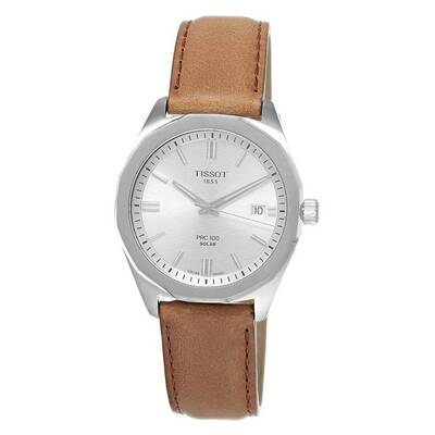 Analog watch with silver-tone stainless steel case, brown leather strap. Features a fixed silver-tone bezel, luminous hands and markers on the silver dial including index hour markers and minute markers around the outer rim. Date display at 3 o'clock position powered by quartz movement. Equipped with scratch-resistant sapphire crystal. Wound via pull/push crown, solid case back. Band width is 20 mm. Water resistant to 100 meters / 330 feet (depth). Functions include hour, minute, second and date display. Sport watch style. Swiss Made label.