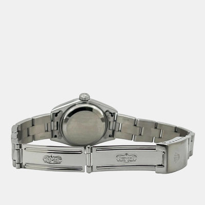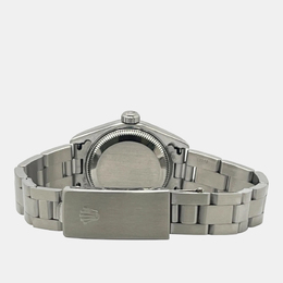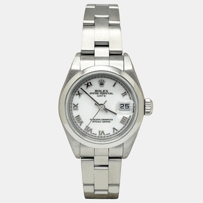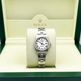A women's automatic wristwatch from Rolex featuring a white dial set in a compact stainless steel case measuring 26 mm. This elegant model showcases minimalist design, renowned precision and exceptional craftsmanship typical of the Rolex brand.