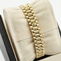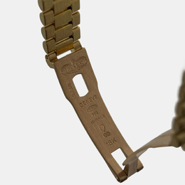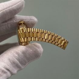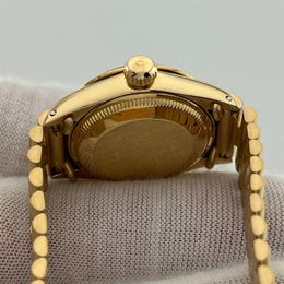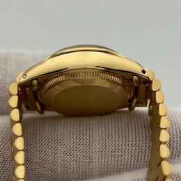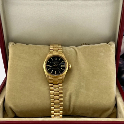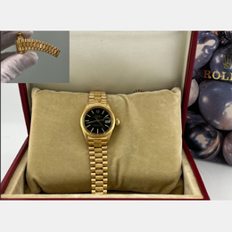 The Rolex Datejust President model 1221983, a ladies' automatic wristwatch. It features an elegant full 18K yellow gold construction paired with a bold black dial creating deep contrast and striking sophistication. Powered by an automatic mechanical movement known for precision and luxury craftsmanship. Case diameter measures 26mm.