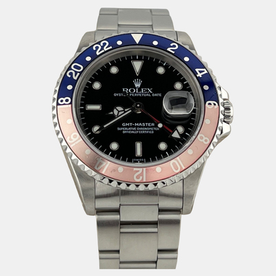 The Rolex GMT-Master II Pepsi, model 16700 (Reference: 1221976), is a distinguished automatic mechanical wristwatch designed for the modern gentleman. Features include an iconic black dial, robust stainless steel case and bracelet, a versatile brown/gray leather strap or NATO-style strap compatible with its 40mm size, dual time zone bezel functionality allowing up to two time zones, and the distinctive Pepsi-type tachymeter scale alongside central hour markers for readability. Its automatic movement ensures precise timekeeping without battery dependency, making it ideal for global travelers needing reliable GMT functionality and a sporty yet classic style statement.