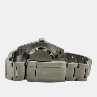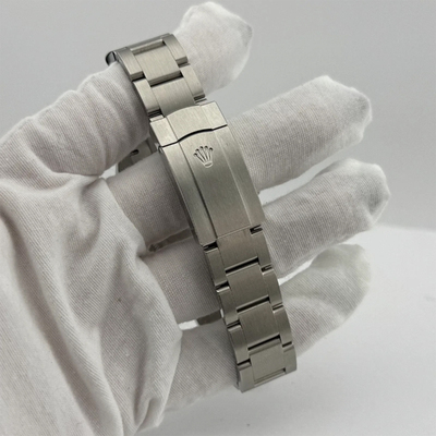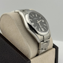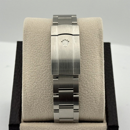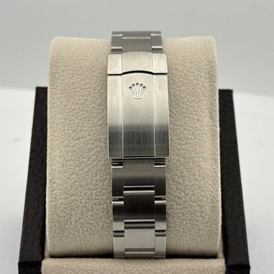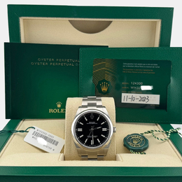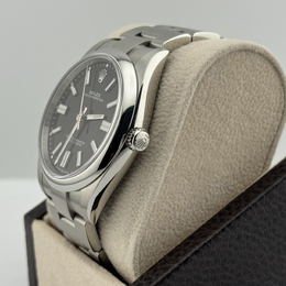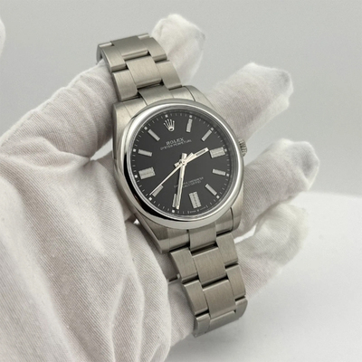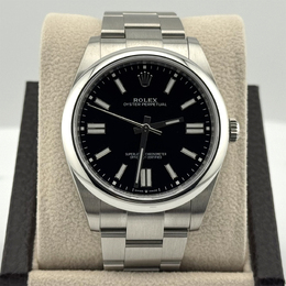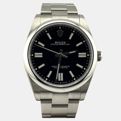 A contemporary Rolex with a commanding presence: the Oyster Perpetual features an automatic movement, a bold black dial presented within its larger 41 mm stainless steel case. Designed for everyday wear, this men's timepiece combines clean aesthetics and high-performance engineering in a water-resistant (up to 100 meters / 330 feet) design.