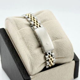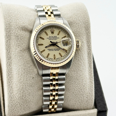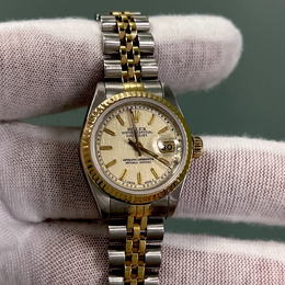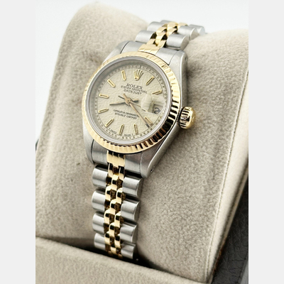 A women's automatic watch from Rolex featuring an ivory dial. The case is crafted from a combination of 18K yellow gold and stainless steel. It has a size of 26 mm and comes with the model number Datejust 69173.