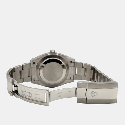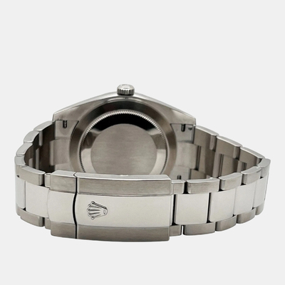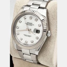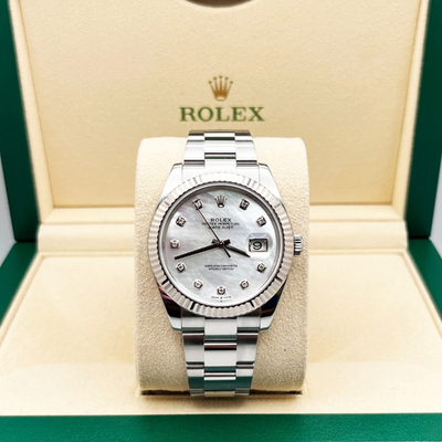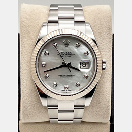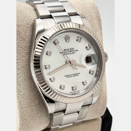 Radiant mother of pearl dial with diamond accents; automatic mechanical movement (caliber 28343); 41mm case combining stainless steel and 18K white gold; luminous Rolex bracelet.