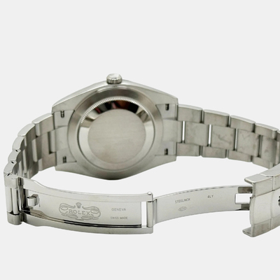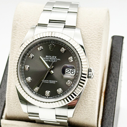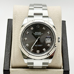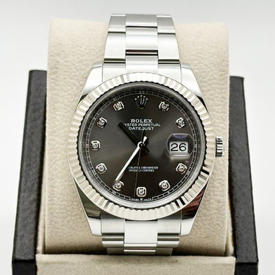 Automatic movement. Slate colored dial accented by diamonds. Stainless steel Oyster case and bracelet crafted in a classic finish. Designed for men, measuring 41 mm. Comes with model number 1221969.