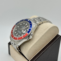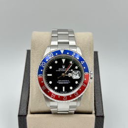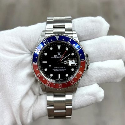 Automatic movement. Stainless steel case, bracelet and bezel with Pepsi design featuring red and blue inserts for dual time functionality. Men's watch sized at 40 mm diameter.