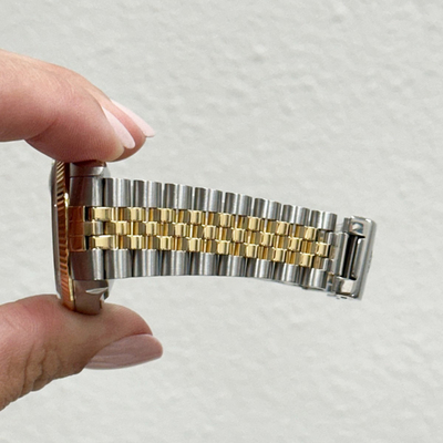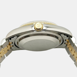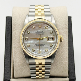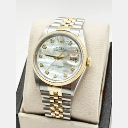 An elegant men's automatic Rolex Datejust. Features a luminous mother-of-pearl dial enhanced with diamonds, housed in an exquisite 18K gold and stainless steel case measuring 36 mm. Equipped with the classic Stainless Steel Jubilee bracelet, this timepiece offers timeless sophistication and combines luxury with versatile daily wear functionality.
