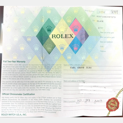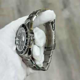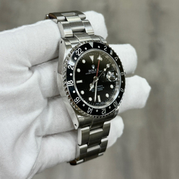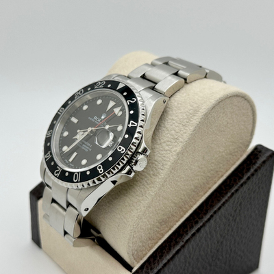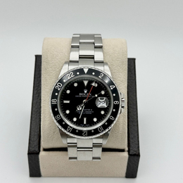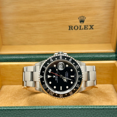 A men's automatic stainless steel Rolex GMT-Master II with black accents and a 40mm diameter. Features an 18K yellow gold bezel insert known for its Root Beer coloring, providing functionality for tracking two time zones simultaneously. The case is crafted from stainless steel.