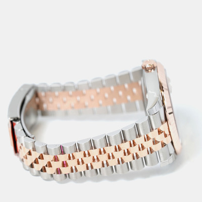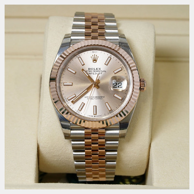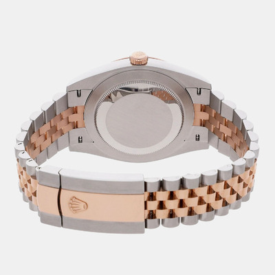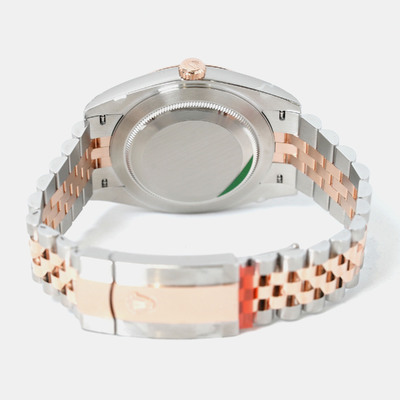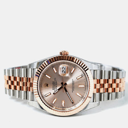 Automatic mechanical movement. 41 mm stainless steel case size. 18K rose gold-tone bezel insert accents. Radiant finish of the sundust dial. Date function visible through sapphire crystal at 3 o'clock position. Water resistant up to 100 meters/330 feet.