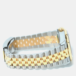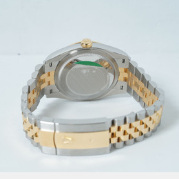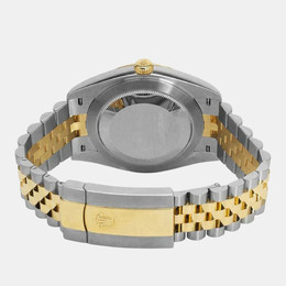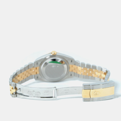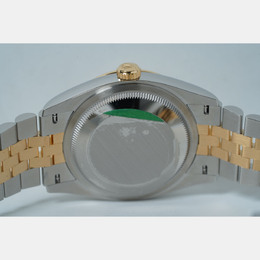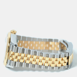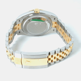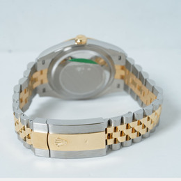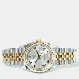A Rolex Datejust model 126233-0031. Features an automatic movement, a luminous silver dial accented with diamond hour markers and possibly other luminous elements for the date window or hands (verify details). Crafted from stainless steel case and bracelet paired with a yellow gold bezel insert. Diamond markers are set on the silver dial at 3, 6, 9, and 12 o'clock positions likely ensuring precision timekeeping including hacking stop functionality when clasp is pulled to release. Water resistant up to 100 meters or 330 feet which corresponds to standard Datejust water resistance specifications suitable for swimming but not diving.